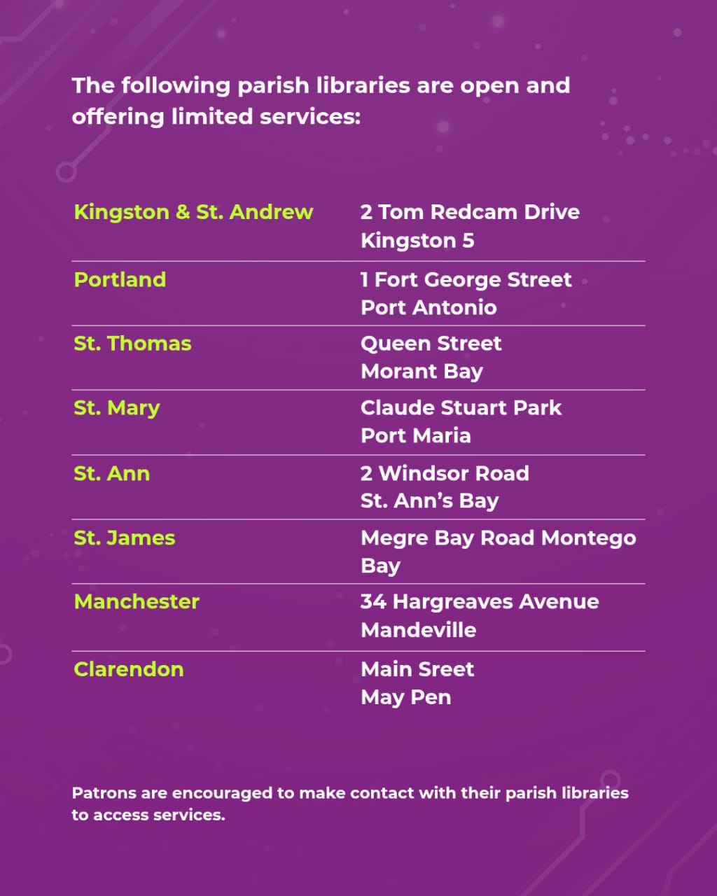 Following the passage of Hurricane Melissa, most libraries have reopened, while some may remain temporarily closed or operate with adjusted hours.